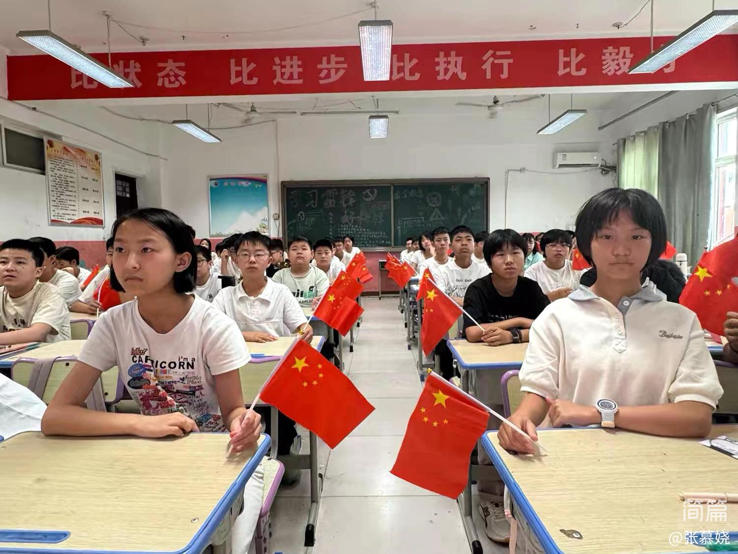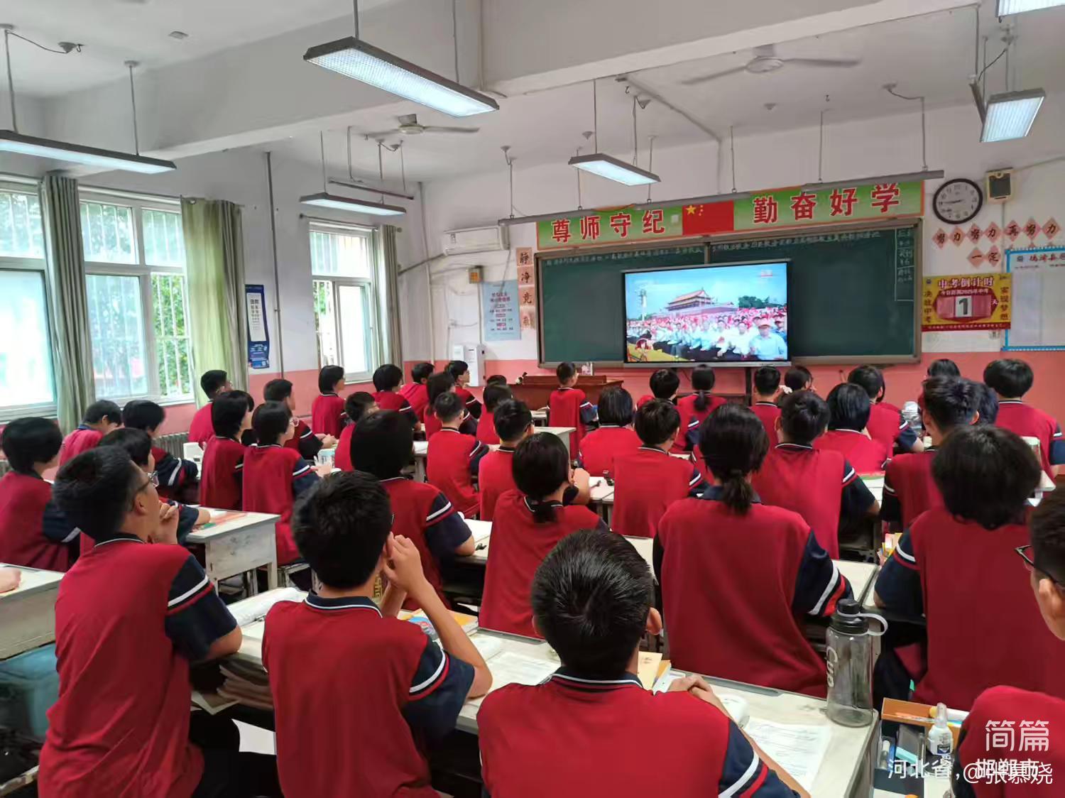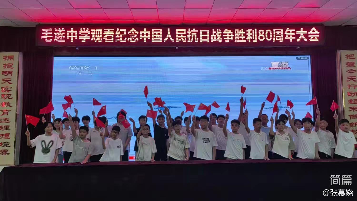 2025年9月3日,中国人民抗日战争暨世界反法西斯战争胜利80周年纪念大会在北京隆重举行,毛遂中学组织全校师生观看。