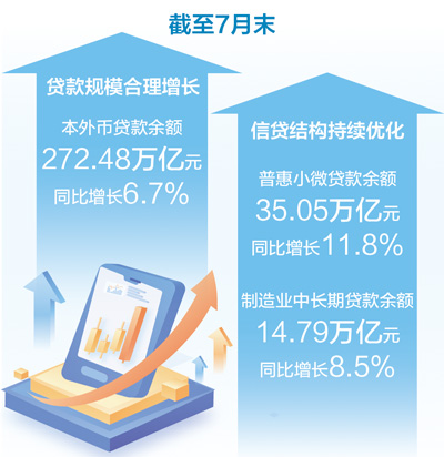 制图:汪哲平 8月13日,中国人民银行发布的最新数据显示:今年前7个月,我国人民币贷款增加12.87万亿元,截至7月末,我国本外币贷款余额272.48万亿元,同比增长6.7%,人民币贷款余额268.51万亿元,同比增长6.9%,金融支持实体经济有力有效。 在贷款规模保持合理增长的同时,信贷结构持续优化,出现不少亮点。截至7月末,我国普惠小微贷款余额为35.05万亿元,同比增长11.8%,制造业中长期贷款余额为14.79万亿元,同比增长8.5%,以上贷款增速均高于同期各项贷款增速。 贷款利率继续保持低位,实体经济融资需求满足度高。7月利率低位运行,新发放企业贷款利率约3.2%,新发放个人住房贷款利率约3.1%,分别较去年同期下降约45个和30个基点。 “利率是资金供求关系的价格信号,利率低位下行反映信贷供给相对充裕,资金需求方获得银行信贷支持更加容易、成本更加优惠。”中国邮政储蓄银行研究员娄飞鹏表示,贷款利率已经在低位运行了很长时间,说明信贷资源供给总体是充裕的,实体经济的融资需求满足度比较高,加上禁止违规手工补息、建立存款招投标利率报备机制、优化非银同业存款利率自律管理等一系列政策的实施,让利率运行机制更加顺畅,既稳住了银行负债成本,也为银行向企业让利提供了更多空间。目前很多地区在推行“明示企业贷款综合融资成本”试点,企业融资成本更加透明,有助于进一步减轻企业融资负担。 据初步统计,前7个月,我国社会融资规模增量累计为23.99万亿元,比上年同期多5.12万亿元,其中,对实体经济发放的人民币贷款增加12.31万亿元。截至7月末,我国社会融资规模存量为431.26万亿元,同比增长9%,其中,对实体经济发放的人民币贷款余额为264.79万亿元,同比增长6.8%。 在货币供应量方面,截至7月末,我国广义货币余额329.94万亿元,同比增长8.8%;狭义货币余额111.06万亿元,同比增长5.6%;流通中货币余额13.28万亿元,同比增长11.8%。前7个月净投放现金4651亿元。 “社会融资规模、广义货币增速均保持在较高水平,体现了适度宽松的货币政策取向,为实体经济提供了适宜的货币金融环境。”招联首席研究员、上海金融与发展实验室副主任董希淼表示,上半年,人民银行又出台了一揽子货币政策,有力支持实体经济回升向好,各项宏观经济指标总体表现良好,接下来,各项政策效果会进一步显现并持续释放,将会对实现全年经济社会发展目标任务提供有力支撑。 在存款方面,前7月,我国人民币存款增加18.44万亿元。其中,住户存款增加9.66万亿元,非金融企业存款增加3109亿元,财政性存款增加2.02万亿元,非银行业金融机构存款增加4.69万亿元。截至7月末,我国本外币存款余额327.83万亿元,同比增长9%,人民币存款余额320.67万亿元,同比增长8.7%。 《 人民日报 》( 2025年08月14日 11 版) |
