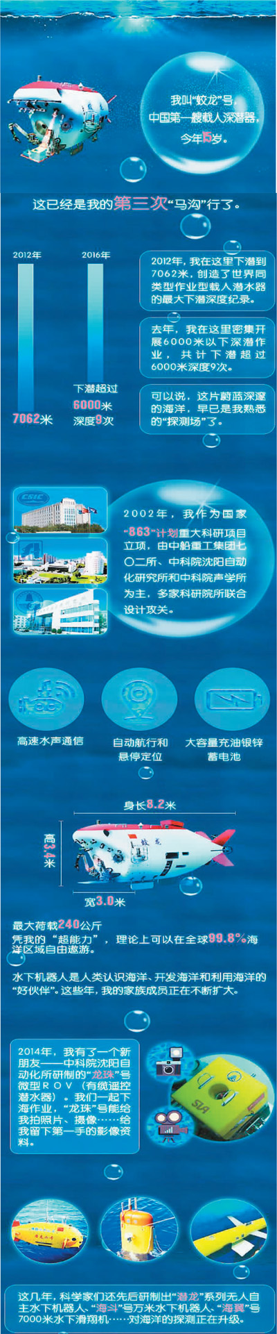狮子鱼、红色巨型海参、球形状白色海绵、蛇尾、海星和玄武岩、近底的海水、失而复得的采水器……这些是我国蛟龙号载人深潜器从西太平洋马里亚纳海沟深处刚刚获得的“战利品”。对于正奋战在那里的我国海洋科考团队来说,无论是蛟龙号捕获的深海精灵,还是取样的岩石和海水等都是那么珍贵、可爱。因为把它们从洋底带到甲板的过程,不仅凝聚着他们多年奋斗的心血和汗水,而且通过对这些样品的深入研究,将有望揭示更多未知的“深蓝”奥秘,为人类进一步深入大洋、探测和开发大洋奠定坚实基础。 马里亚纳海沟见证中国荣耀 对中国人尤其是海洋科技工作者来说,地球最深处的马里亚纳海沟虽然遥远而神秘,却又是那样熟悉和温暖,因为这里近年来数度见证属于中国蓝色科技的新突破,让人们品味到成功的喜悦。 2012年6月27日,蛟龙号7000米级海试在这里举行,最大下潜深度达7062.68米,创造了国人引以为傲的“中国深度”,也是世界上同类型潜水器的最深纪录。 2016年4月,蛟龙号再次抵达西太平洋马里亚纳海沟区域。这是进入试验应用阶段,正式“服役”科考后,蛟龙号第一次在这里作业,进行了密集的深潜,其中9次在6000米级,最大下潜深度几乎达到7000米。蛟龙号表现堪称优秀:多次实现长距离、大落差航行,水下航行距离最长达到5000米、水下作业爬升高差最大1100米、单潜次最大地质样品取样重量达124千克。创造了自下潜以来单潜次航行距离、作业高差及地质样品取样重量的最大纪录。 2016年12月27日,中国深渊科考队在马里亚纳海沟进行3台万米级全海深探测器(着陆器)海试,最大下潜深度达到10890米,并成功地进行了一系列科学考察作业,获得了宝贵的万米深渊的生物、微生物及海水样本和影像资料。这标志着中国已经成为世界上第三个掌握全海深无人深潜器技术的国家,也是第一个同时拥有无人深潜器和多台着陆器协同作业能力的国家,为全球科学家开展深渊海沟的研究作出了重大贡献。 4年实战磨砺优秀性能 蛟龙号本次征战马里亚纳海沟是在执行中国大洋38航次第三航段科考任务。据悉,蛟龙号在此海域深潜,旨在获得该海域名为“挑战者”的深渊底层水体基本环境特征,揭示深渊水平环流结构及其时空变化和动力机制;掌握深渊沉积物、铁锰氧化物、岩石的矿物学与地球化学特征,阐明深渊底部物质来源与地质活动规律;明确深渊底部微生物与大生物群落结构的空间演替规律,揭示深渊底部生命演化与适应性机制。 第三航段首席科学家陈新华表示,蛟龙号下潜作业获得的岩石等样品,对研究马里亚纳海沟的成因以及其构造演化具有重要意义;采集的生物样品对于促进深水生物多样性、生态系统、生物地理学等研究具有重要价值。当然,通过下潜和作业过程,下潜团队继续对潜水器的航行控制、均衡调节、机械手及作业工具等进行全面测试,进一步确认了潜水器技术状态。根据计划,本航段是蛟龙号试验性应用阶段的“收官之战”。在此前进行的本航次前两个航段中,蛟龙号分别出色完成了对西北印度洋多金属硫化物区和南海南海珍贝海山区域的相关科考任务。 从2013年开始,蛟龙号就从研制和海试阶段,转入试验性应用阶段。当年6月,蛟龙号启程赴南海,拉开了首个实验性应用航次的序幕。在该航次的首个航段中,蛟龙号的应用性能开始接受科考实战的首次检验,共完成10次下潜,验证了精准的精确定位系统,实现最长距离海底巡航等上佳表现。2014年底和2015年初,蛟龙号首次在印度洋中国大洋协会多金属硫化物资源勘探区执行科考任务,并对国产超短基线定位系统等进行了测试。2016年4月和5月,蛟龙号分别在太平洋维嘉海山的西北侧海域和雅浦海沟完成了科学应用下潜。 “蛟龙”家族助力走向深蓝 作为我国自主设计、自主集成的高性能载人深潜器,蛟龙号将进入常态化运营阶段。可以预期的是,它的性能将适应科考需求继续改进,进入更加成熟稳定的收获期。 中船重工702所是蛟龙号牵头研制单位,该所水下工程研究开发部主任胡震指出,蛟龙号虽然表现出色,但毕竟从设计距今差不多15年了,蛟龙号既面临部分装备升级的问题,又有提高科考效率、降低成本的需求。 为适应党的十八大提出的“建设海洋强国”目标,进一步推动实现“深海进入、深海探测、深海开发”,我国必须建造更多载人潜器,发展出阵容强大的“蛟龙”家族。就设计下潜深度而言,既要发展约3000米左右的,又会发展少量面向深蓝比如万米深度的载人潜器。就主要服务领域而言,这些载人潜器将面向科考、资源开发、救助打捞、深海探险、电影拍摄、观光旅游等多领域。实际上,我国万米级载人潜器研制工作已经启动,其总设计师正是曾担任蛟龙号主任设计师兼潜航员叶聪。今年3月,他曾向媒体透露说,万米级载人潜器研制工作将于2020年完成;而4500米载人潜器正在总装联调,即将进入下一阶段试验。 |