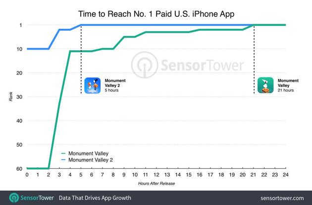 新浪科技讯 北京时间6月7日早间消息,自Ustwo在本周的苹果全球开发者大会(WWDC)上发布《纪念碑谷2》以来,这款游戏已迅速占据了苹果美国App Store的榜首。 目前判断《纪念碑谷2》能否超过前作还为时过早,但这款游戏取得了不错的开始。市场研究公司Sensor Tower表示,广泛的品牌认知度和庞大的粉丝群体帮助《纪念碑谷2》登上了付费应用的第一名,这一上升速度达到前代游戏的4倍。此外,尽管价格达到4美元,但《纪念碑谷2》也在全球44个国家成为排名第一的iPhone游戏。(免费游戏通常占据榜首。)