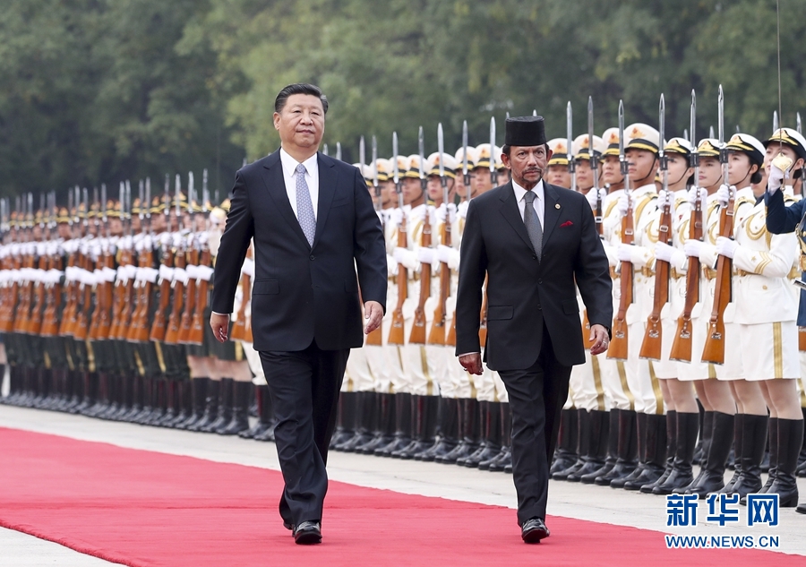 9月13日,国家主席习近平在北京人民大会堂同文莱苏丹哈桑纳尔举行会谈。这是会谈前,习近平在人民大会堂东门外广场为哈桑纳尔举行欢迎仪式。新华社记者 谢环驰 摄