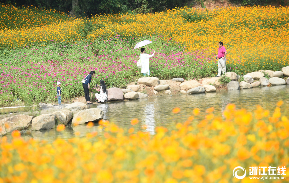 10月8日,中秋国庆长假的最后一天,一些杭州市民和游客远离热闹景区,来到郊区转塘看花海。这处花海紧邻云栖小镇,面积有几十亩,花卉以菊花为主,眼下已经悄悄绽放,让人赏心悦目。(浙江在线记者 吴元峰 摄)