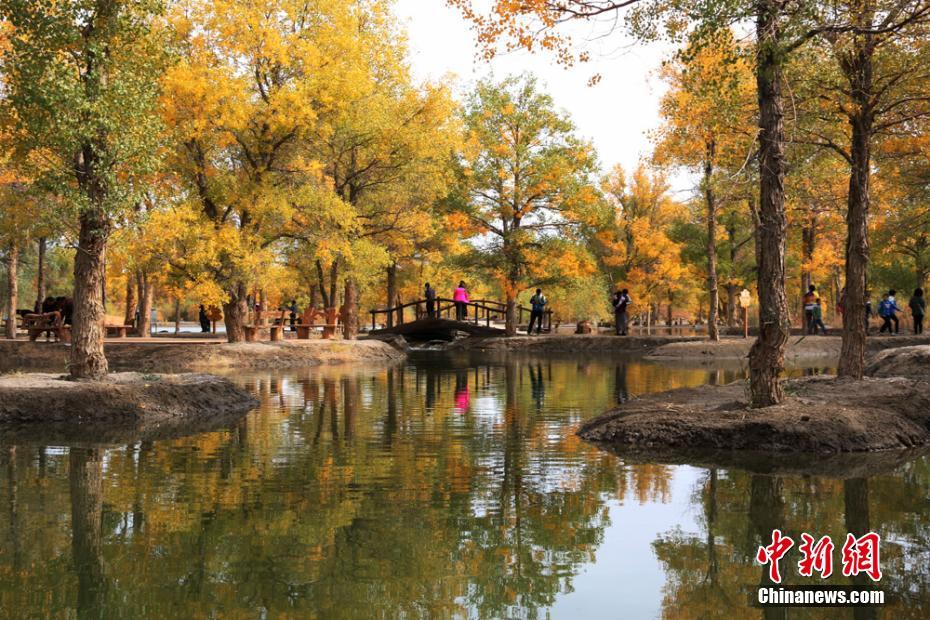 金秋十月,甘肃酒泉金塔胡杨林遍披“金装”,泛着金光的胡杨叶子,与碧波荡漾的金波湖水域相互辉映,吸引了各地游客前来游览观光,欣赏胡杨林秋景。金塔沙漠胡杨林位于甘肃金塔县城以西的潮湖林场,为三北防护林体系的一部分。那里有着上万亩人造胡杨林。每到秋日,这里便成了金色的世界。朱希彬 摄