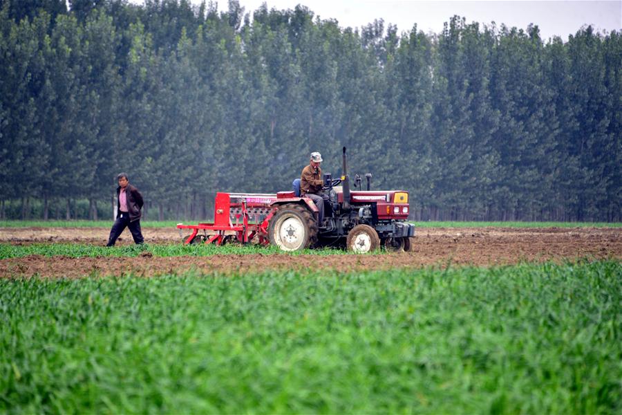 10月11日,农民驾驶农机在山东省聊城市茌平县贾寨镇侯楼村田间播种小麦。正值麦播时节,山东聊城市茌平县农民抢抓农时,做好冬小麦播种工作,力争来年取得好收成。 新华社发(赵玉国 摄)