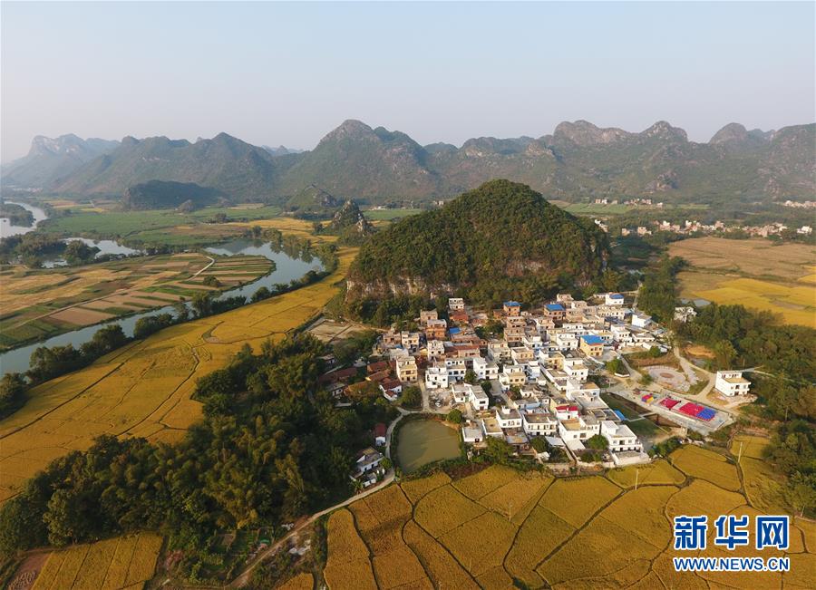 11月2日拍摄的上林县一处稻田及其周围景色。近日,广西上林县大面积晚稻进入收割季节。金色的稻田、蜿蜒的河流、错落的村舍,构成了一幅幅迷人的金秋田园图画。 新华社记者 陆波岸 摄