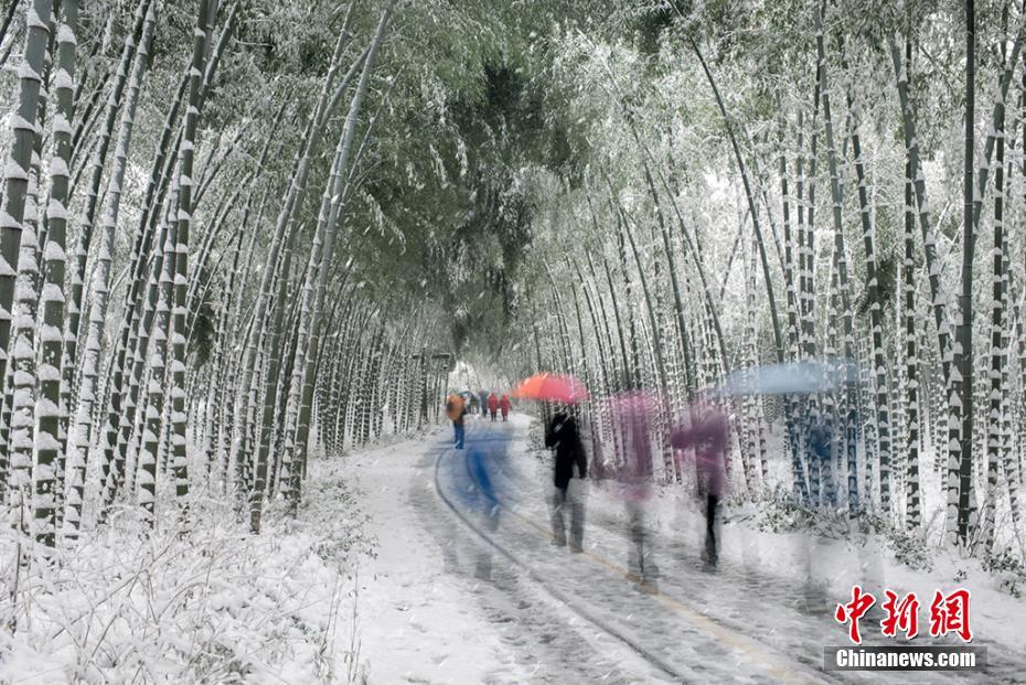 1月25日,江苏溧阳南山竹海迎来降雪天气,万亩翠竹银装素裹,一派北国风光景象。江苏溧阳天目湖南山竹海地处江苏、浙江和安徽三省交界处,以竹文化和寿文化为主题,坐拥3.5万亩翠竹。图为游客徜徉在竹海之间。 寒单 摄
