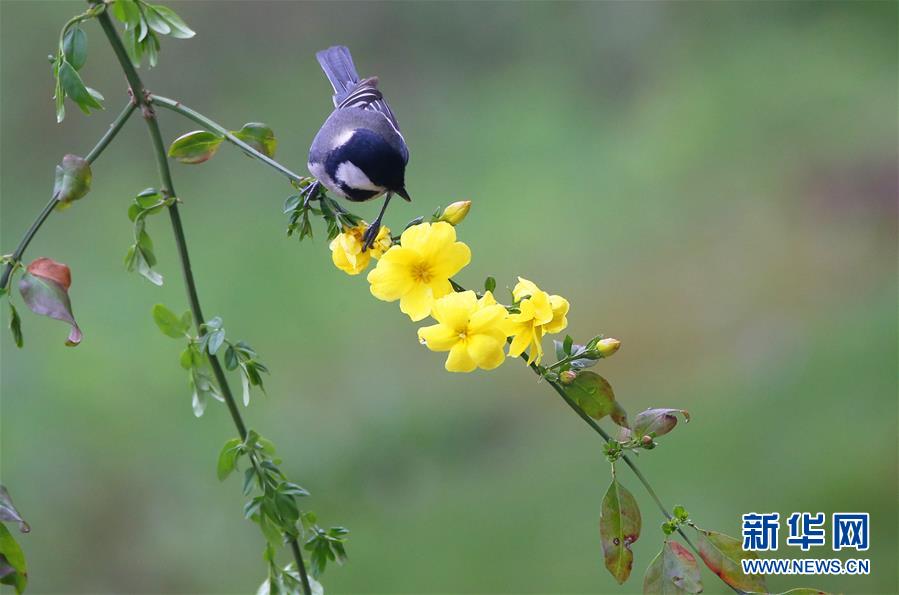3月14日,在湖南省衡阳市生态公园,一只小鸟停留在花枝上。新华社发(曹正平 摄)