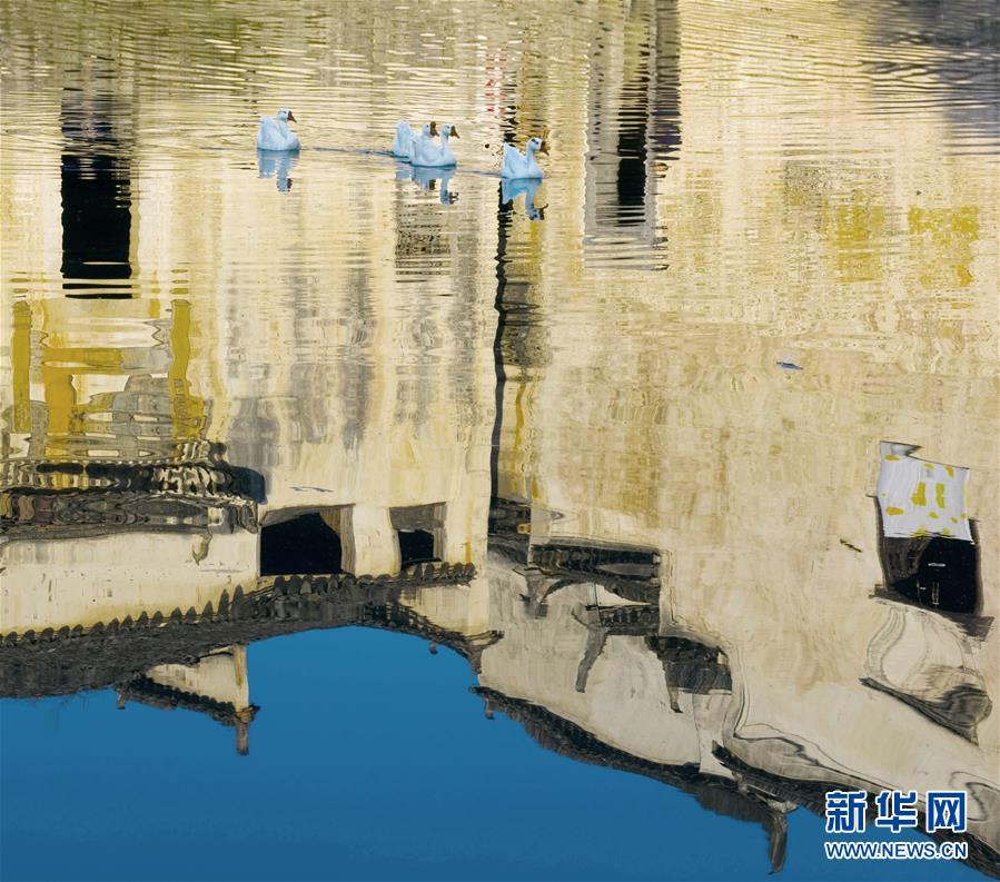 4月15日,在安徽省黟县宏村,几只游动的鹅和水中徽派古民居的倒影,构成一幅唯美画卷。 新华社发(潘正光 摄)