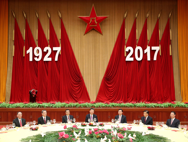 7月31日,中华人民共和国国防部在北京人民大会堂举行盛大招待会,热烈庆祝中国人民解放军建军90周年。中共中央总书记、国家主席、中央军委主席习近平和李克强、张德江、俞正声、刘云山、王岐山、张高丽等党和国家领导人出席招待会。新华社记者 鞠鹏 摄
