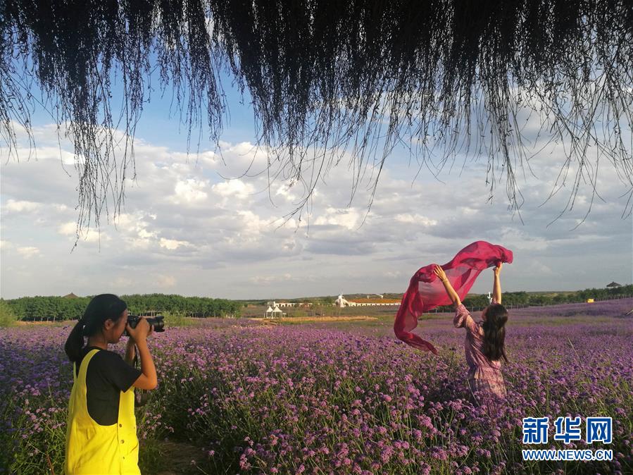 宁夏艾伊薰衣草庄园内大片马鞭草竞相开放(8月10日摄)。初秋时节,地处宁夏银川市兴庆区境内的毛乌素沙漠边缘,一片绚丽花海与灰黄色的沙漠形成鲜明对比。这片“沙海”中的“花海”是宁夏艾伊薰衣草生态旅游观光基地利用三年时间,在毛乌素沙漠边缘建起来的。基地内种植薰衣草、马鞭草、九叶菊等十余种花卉及樟子松、新疆杨等二十余种树木,总面积达3300多亩。在种植花卉、树木恢复生态的同时,将花卉观光与沙漠体验旅游相结合,吸引不少游客。在昔日寸草不生的沙漠通过生态发展的方式淘出“真金”。新华社记者 王鹏 摄