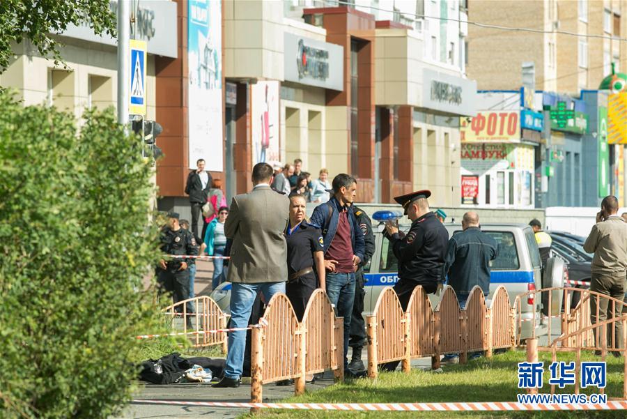 8月19日,在俄罗斯中部城市苏尔古特,警察在持刀行凶事件现场调查。
