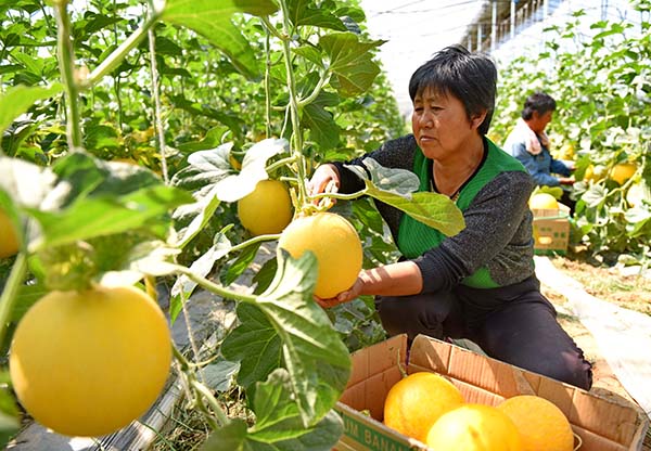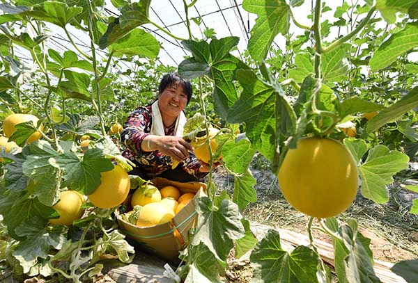 5月24日,河北省新河县众乐现代农业合作社的社员在大棚内采摘甜瓜。
