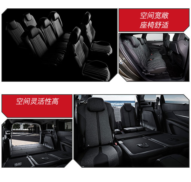 3.空间灵活性高 标致5008共有5座及7座车型可选,5座车型优势有较大的后备箱空间,而5座版能做到7座版一样能行。7座版采用2+3+2座椅布局,第二排座椅可大幅度调节,第三排座椅也可以独立放倒,第三排两张独立座椅可以完全放平作为后备箱空间,且还可以将拆卸下来,出去野炊或者钓鱼老婆再也怕找不到凳子了,这样格局也形成了“5+2”的灵活组合。