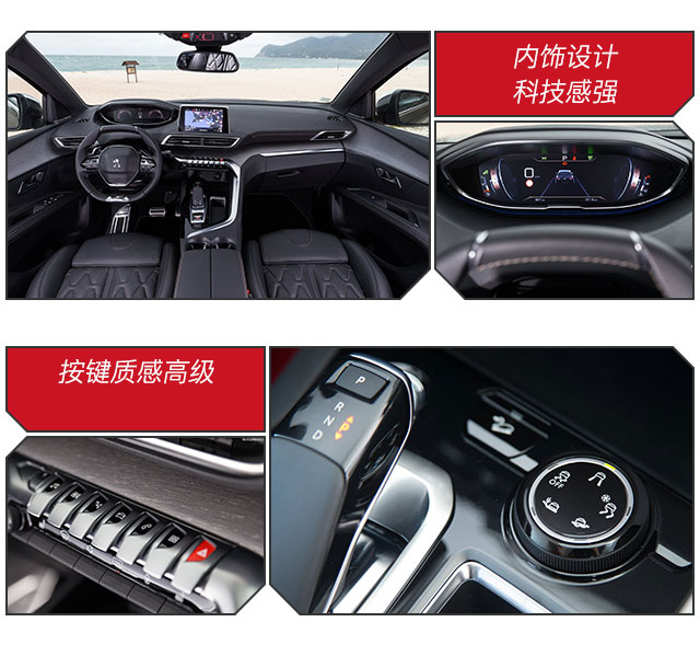 2.科幻的内饰设计 都说标致5008是4008的plus版,进入到车内依旧是熟悉的感觉。标致5008采用i-Cockpit唯我座舱设计,比起外观,这个颇具民航驾舱风格的驾驶舱更让人爱不释手,且视觉体验效果,就是一眼就能记得。12.3英寸全液晶仪表盘、8英寸悬浮式触控屏、超跑式的按键,科技感的电子档把等,让整体内饰风格有很强的科技感。