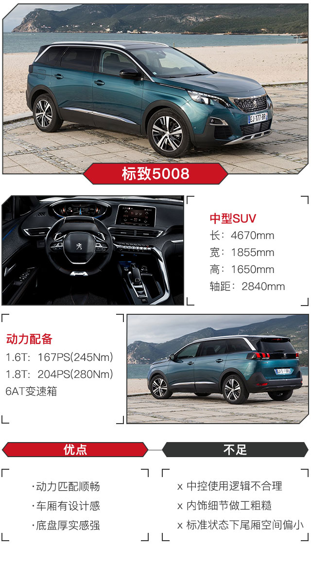 整体而言,标致5008是一款结合了运动和舒适两种性格的车型。 配置推荐 标致5008/分为两个排量共7款车型,其中1.6T有3个车型,1.8T有4个车型。从下面所列可以看出,入门级的领先版18.77万元的售价非常有诱惑力,并且在配置上已经能满足基本的使用。然而更推荐依然是1.6T及1.8T精英版车型,配备了无钥匙进入、一键启动、全景天窗、驾驶员座椅电动调节等非常基础的配置,性价比非常高。