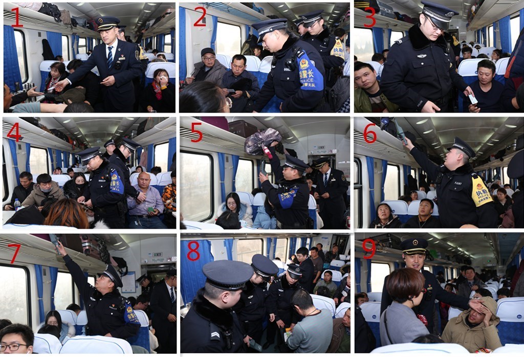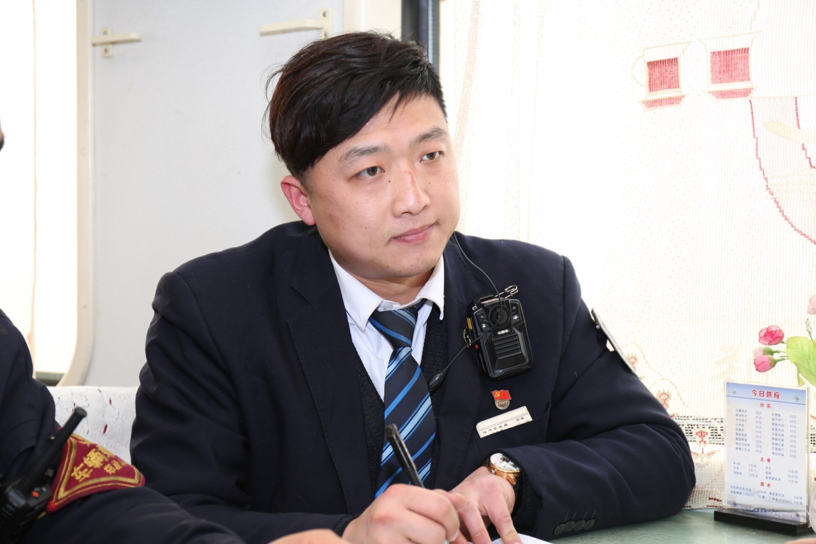他叫薛江涛,中共党员,今年32岁,从警12年,党龄8年,是郑州铁路公安局洛阳公安处乘警支队的一名乘警长,主要负责京快六组K183/4列车的乘务安保工作,工作至今已有12个年头。 1月12日,由北京开往南阳的K183次列车由北京站始发,乘警长薛江涛忙完旅客安全乘车后,向我们讲述了2019年的春运工作内容,今年的工作主题实践活动是:践行宗旨当先锋,护航平安展作为。我们洛阳乘警支队的工作措施有六大内容要点:1.严格落实警务装备的佩戴和使用,加强巡视宣传、夜间提醒,强化旅客自防意识,搞好治安防控;2.严格落实四色预警指令,强化重点人员查控;3.严格按照铁路公安局《旅客列车常见警情处置指引》,依法规范处置霸座、无票乘车等问题;4.严格落实三乘检查、行李车、发电车等重点部位的消防检查,督促整改和依法处罚发现的问题,严防发生火灾事故;5.严格落实值班备勤、值乘勤务和警容风纪,遇到上级检查主动汇报工作情况,并向所属大队和支队指挥室报告;6.遇有列车晚点、客流积压、秩序混乱等突发情况,以及发生突发重大警情事件以及敏感问题,立即上报指挥室,按照预案及时处置,坚决杜绝迟报、瞒报、漏报等问题。