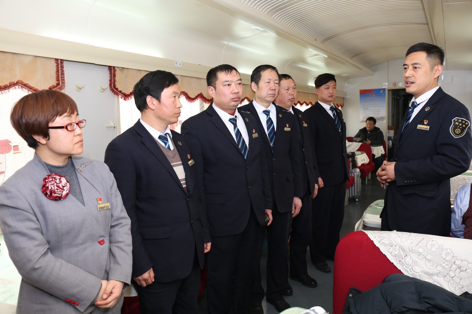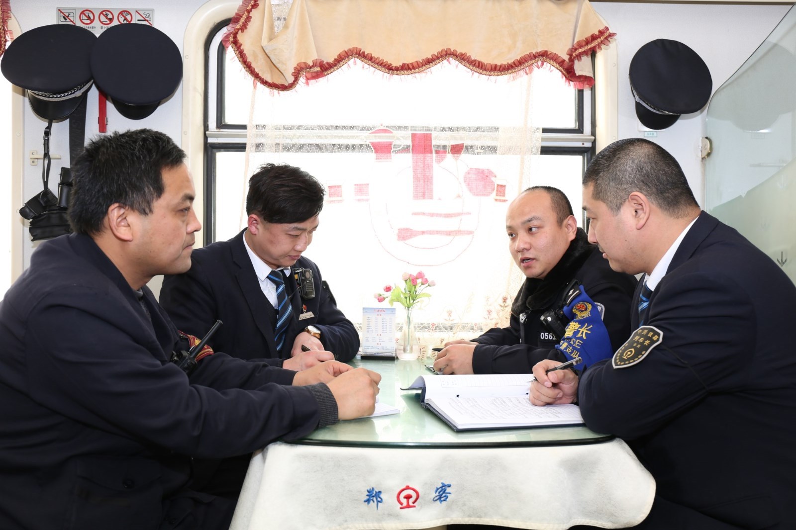 上图为列车长和勇组织乘警长薛江涛、乘务长关海彪、副车长孙海,召开列车2019年春运安全会议,确保春运安全工作的有力保障和平稳有序。落实铁路总公司提出的“平安春运、有序春运、温馨春运,让旅客体验更美好”的服务宗旨。