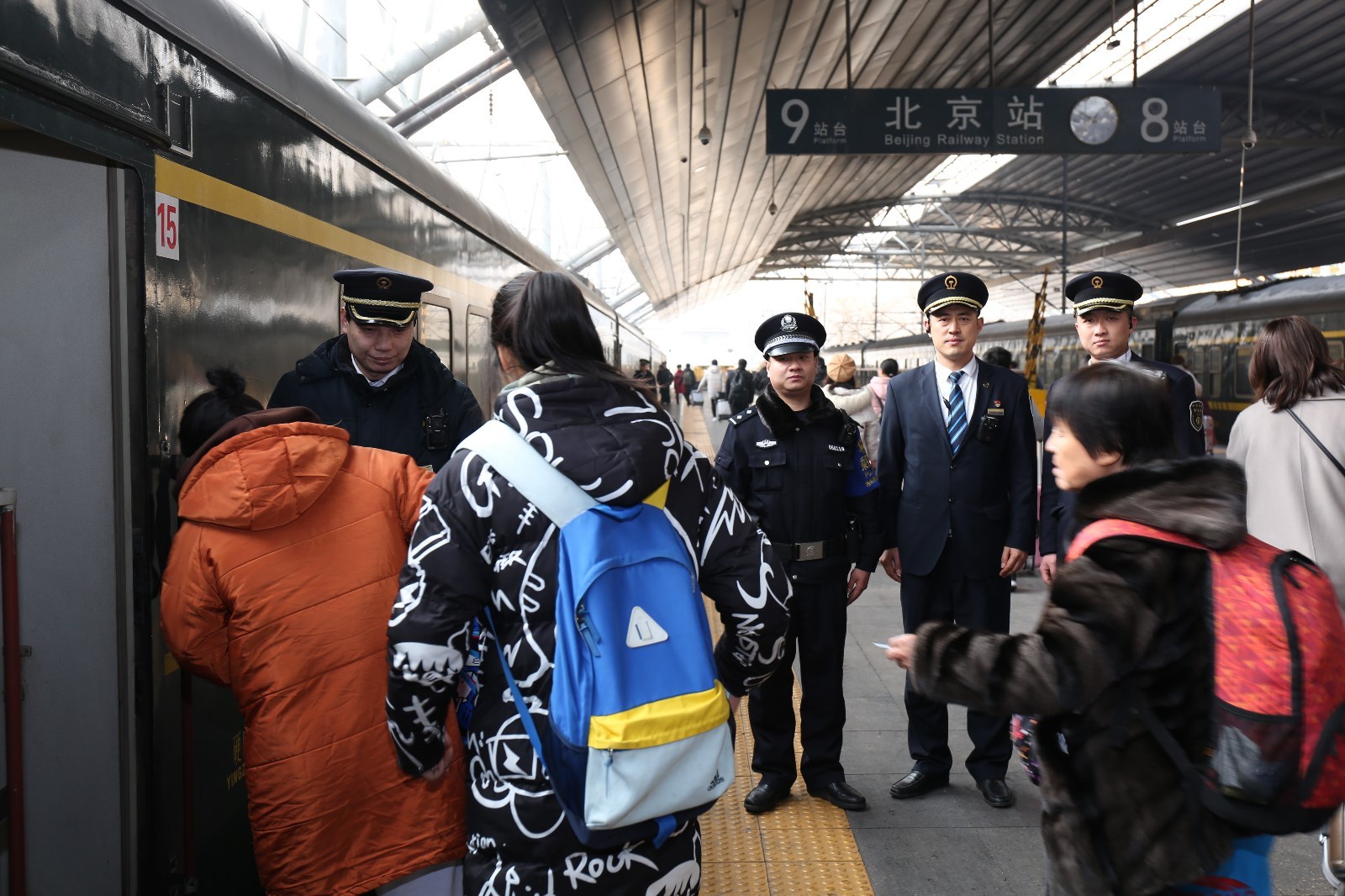 1月12日12:30分,在北京站第九站台, K183次列车长路爱伟和副车长孙海、乘警长薛江涛,在站台上进行安全巡视、服务工作,并合影留念。 据悉,K183次列车由北京站始发开往南阳,列车始发站乘车人数为1220人次,硬座超员率达到10%,与日常乘车相比,此次的乘车人数,已体现出春运的即将到来。