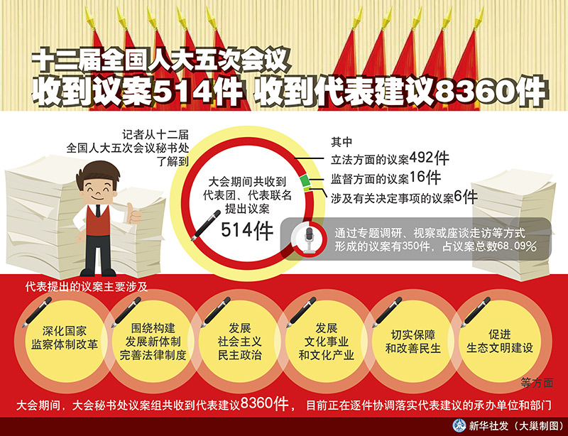 人民代表大会制度是人民当家作主的生动体现。人大代表履职尽责的过程,是依法行使国家权力的过程,也是为事业发展凝心聚力的过程。会议期间,代表们认真审议政府工作报告等报告,审议民法总则草案,代表人民依法参与管理国家事务;围绕供给侧结构性改革和民生热点问题献计出力,提出议案514件、建议8360件。从大局出发想问题、敢担当、求实效,为改革发展想办法、出思路、支实招,人大代表们广泛凝聚人民的智慧和力量,生动诠释了人民代表大会制度的生机活力和巨大优越性。