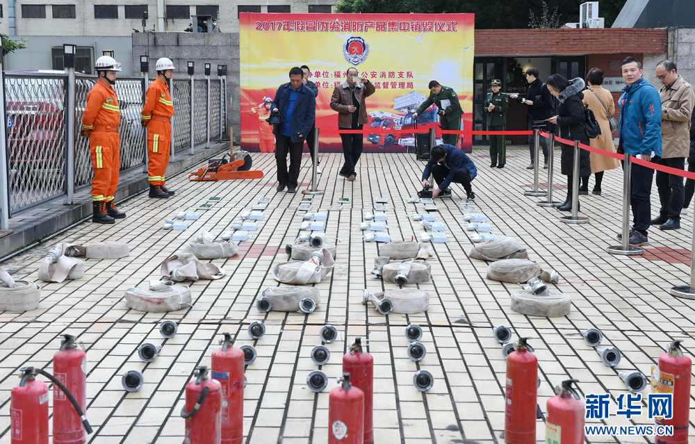这是3月14日拍摄的2017年福州市假冒伪劣消防产品集中销毁仪式现场。当日,福州市公安消防支队联合福州市市场监督管理局、市公安局经侦支队在福州“于山堂”举行2017年福州市消防产品专项整治动员部署会暨假冒伪劣消防产品集中销毁仪式,共集中销毁假冒伪劣消防产品500余件(套)。全市230家消防产品生产单位、销售单位、消防工程施工(维保)单位,部分房地产企业,消防安全重点单位的负责人参加活动。新华社记者林善传摄