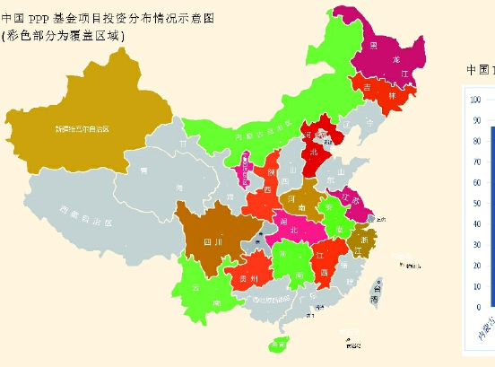 中国PPP基金项目投资分布情况示意图(彩色部分为覆盖区域)