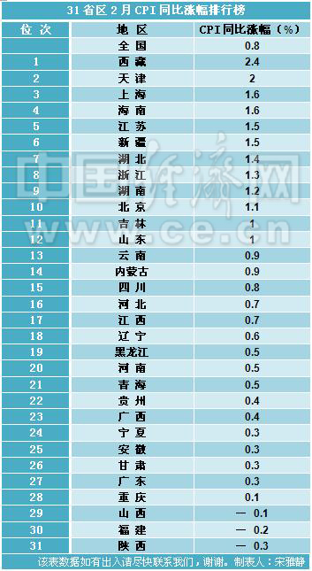 31省区2月CPI涨幅排行榜。中国经济网记者宋雅静/制图