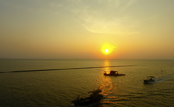 5月1日清晨,海南省琼海市的渔船在霞光中陆续返回潭门港准备休渔。