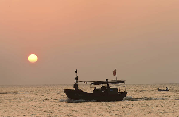 5月1日清晨,海南省琼海市的渔船在霞光中陆续返回潭门港准备休渔。 5月1日12时起,我国渤海、黄海、东海及北纬12度以北的南海(含北部湾)海域进入伏季休渔期。 新华社发(蒙钟德 摄) |