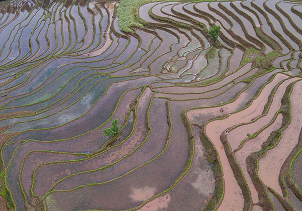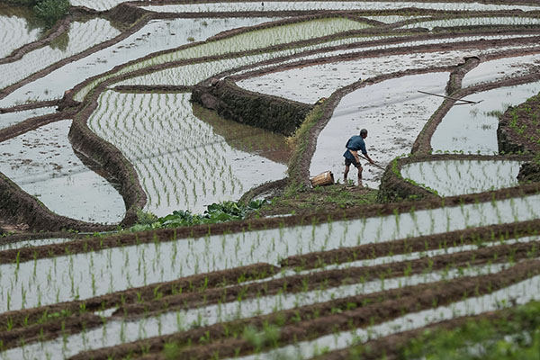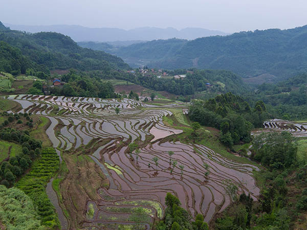 5月1日,在四川省乐山市沙湾区葫芦镇四峨山,村民在梯田上整理田地准备插秧。
