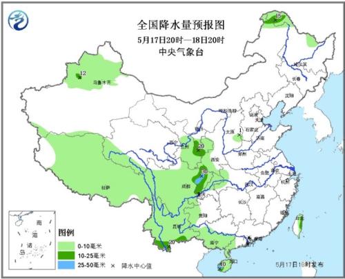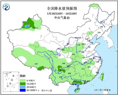 受高压脊东移影响,18至19日,华北、黄淮北部、内蒙古中东部、东北地区西部等地温度将继续上升,上述地区将有35℃以上的高温天气,其中内蒙古东部、河南北部等地的部分地区最高气温有37~39℃,内蒙古东南部局地可达40℃。中央气象台5月17日18时发布高温黄色预警(见图1)。20日开始,受冷空气和降水共同影响,上述地区的高温天气范围将明显减小。 华南南部沿海将有大到暴雨 受热带扰动影响,18日夜间至20日,广西南部沿海、海南岛西部、广东西南部自西向东将先后出现大到暴雨,局地大暴雨,上述地区并伴有短时强降水或雷暴大风等强对流天气。 另外,18日夜间至19日,新疆北部将有较强降雨,其中塔城、伊犁河谷、沿天山地区有中到大雨,局地暴雨。 未来具体预报 17日20时至18日20时,甘肃东南部、四川盆地东部、云南南部、海南岛南部、台湾东部等地的部分地区有中雨,局地大雨(见图2)。