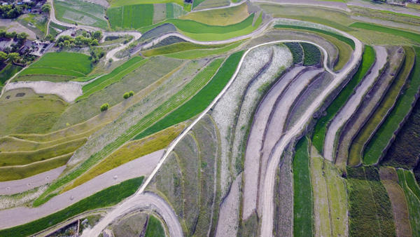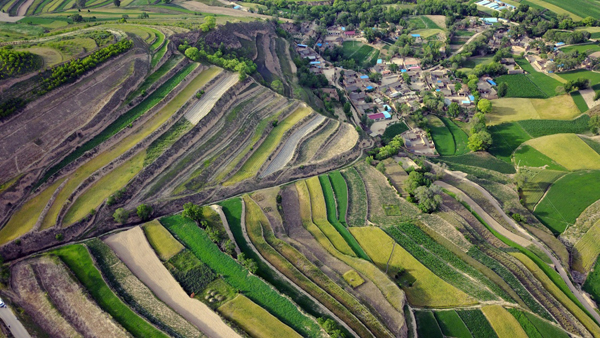 这是6月22日拍摄的甘肃省通渭县梯田。 盛夏时节,甘肃省通渭县山间的梯田层层叠叠,色彩斑斓,在黄土高原上绘制出一幅幅美丽的画卷。 新华社记者 范培珅 摄 |
