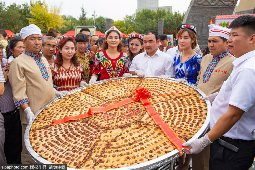 摘要:2018年9月21日,为了喜迎首届中国农民丰收节,新疆维吾尔自治区库车县大馕城制作出具有特色的月饼馕来迎接这样盛会活动,一经展示,立刻让现场近千名群众和游客直流口水,大家纷纷拍照留念和品尝。 上图为,该月饼馕直径为1.7米,10名打馕师傅从选料、烘烤到出馕坑,花费了20余个小时,用去70公斤面粉,玫瑰花酱50公斤,核桃仁、巴旦木,杏仁等10余公斤,打出了重约100公斤的库车特色月饼馕。 上图为以这个圆形的月饼馕,祝福全国各族群众首届中国农民丰收节快乐,同时祝福中国的未来越来越美好。 上图为现场观众和游客争相品尝巨型月饼