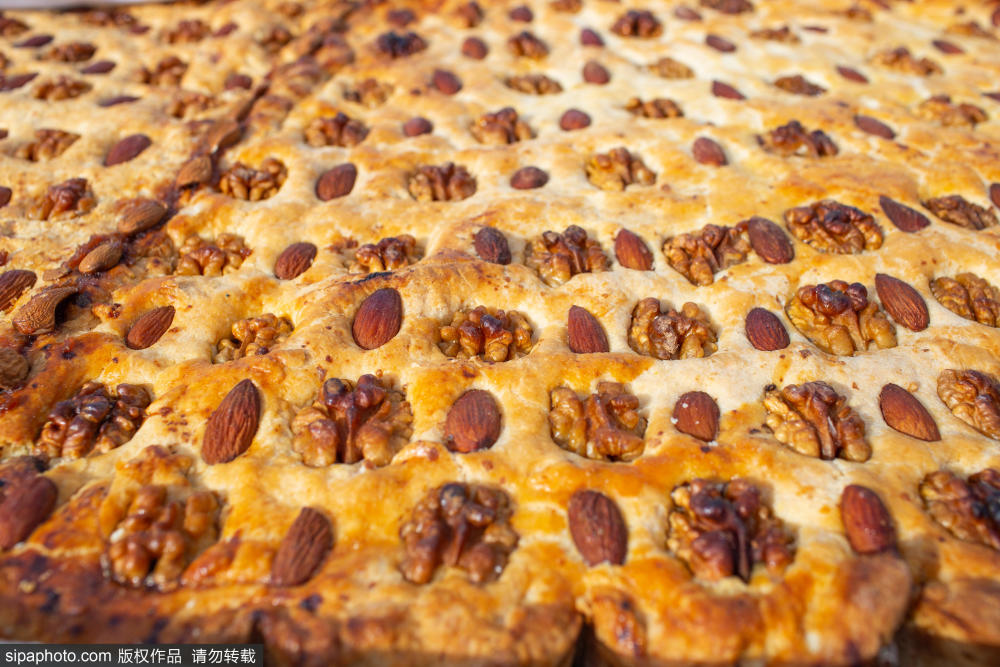 上图为,该月饼馕直径为1.7米,10名打馕师傅从选料、烘烤到出馕坑,花费了20余个小时,用去70公斤面粉,玫瑰花酱50公斤,核桃仁、巴旦木,杏仁等10余公斤,打出了重约100公斤的库车特色月饼馕。