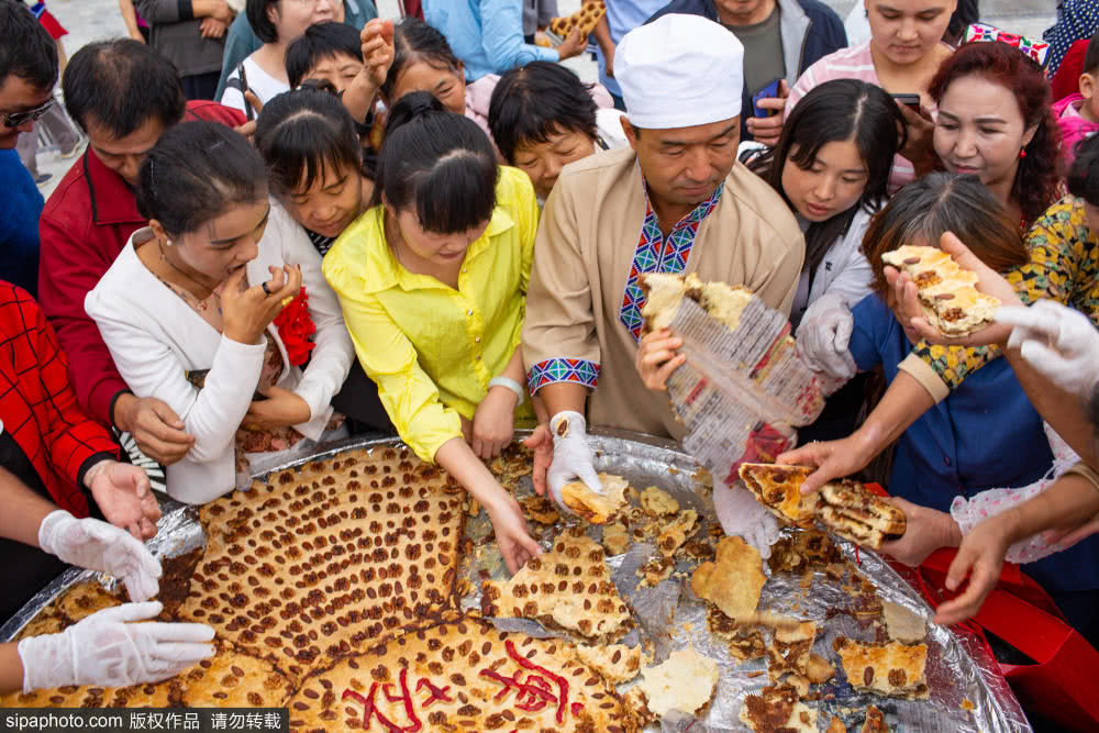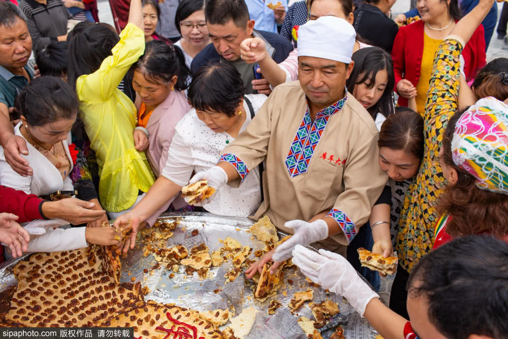 上图为现场观众和游客争相品尝巨型月饼馕。