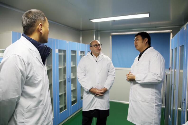 国家药用辅料工程技术研究中心人员为John Giannone总监做介绍 John Giannone总监首先来到依托尔康制药成立的国家药用辅料工程技术研究中心,参观了精密仪器室、小试和中试实验室以及标准物质开发试验室等科研场所,工程中心人员就科研团队、科研设备、研发成果以及取得的各项认证和资质等情况进行了介绍。John Giannone总监听取完介绍后重点就产品标准和检验检测方法等内容和技术人员开展了交流。