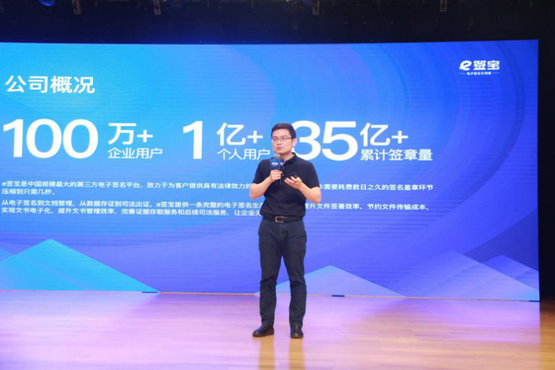 (e签宝创始人兼CEO金宏洲) e签宝创始人兼CEO金宏洲出席并发表演讲。在移动互联网和云计算的高速发展的当下,电子签名异军突起,并且随着相关政策的引导和企业降本增效需求的膨胀,电子签名呈现爆发式发展。e签宝是国内最早从事研究和推广电子签名的企业,也是国内规模最大的第三方电子签名平台,从2002年创立到现在,e签宝始终走在行业前列,已经拥有52项著作权、16项发明专利,承担2项国家级课题项目。会上,金宏洲宣布了e签宝最新的累计签署量,服务超过100万家企业用户,个人用户突破1亿,累计签章量达到35亿次。 金宏洲表示“数字化时代,电子证据将会成为证据的主要形式。基于电子签名的电子证据,是可靠电子证据的主要形式”,然而,目前市面上许多电子签名企业提供的产品仅仅局限于签署的范畴,其证据属性也未被完全认可,因此e签宝要打造的是以签署为核心,提供完整电子签名服务闭环,打通包含公证处、仲裁庭、律所、法院、CA、公安部等机构在内的一个完整生态平台,并提供从签名到证明的一站式证据服务,这是e签宝的发展方向,也是万众期待的,整个电子签名行业的必然趋势。