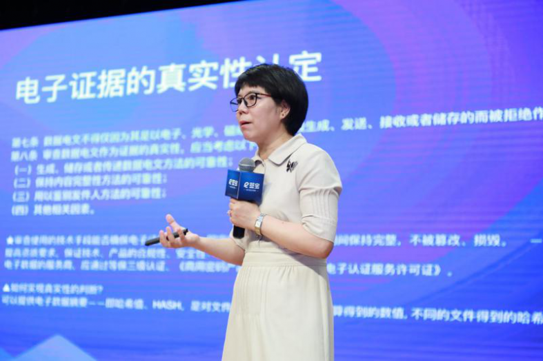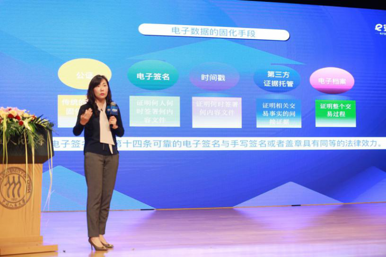 (e签宝创始人兼CEO 金宏洲) 同时,金宏洲认为未来电子签名企业要想取得长足发展,还需做好三件事:不断扩大行业广度,除了金融、电子商务外,还要扩大应用场景,例如互联网政务、城市服务、数字版权等服务;同时深挖服务深度,让电子签名获得更多主管部门的认可,并提供更智能的衍生服务;最后引入区块链、标识密钥、人工智能等更多新技术支持发展。 亮点不断,大咖齐聚共话电子证据 此次研讨会行业大咖云集,观点精彩纷呈,不仅是一场学术交流会,更是一场思想碰撞和智慧分享的巅峰盛宴。
