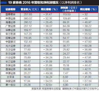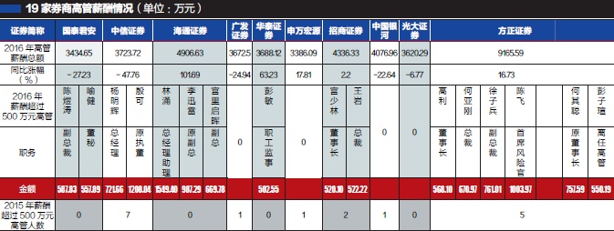 从营收来看,中信证券营收最高,达380.02亿元;华安证券营收最低,为17.34亿元,前者是后者22倍多。与2015年相比,东方证券营收下滑幅度最大,达55.44%;国海证券下滑幅度最小,为22.62%。 分区间来看,营收超过200亿元的券商,有中信证券、海通证券、国泰君安和广发证券4家;营收在100亿~200亿元之间的有华泰证券、申万宏源、中国银河和招商证券4家;营收在100亿元以下的券商有光大证券、方正证券、东方证券等11家。 从净利润来看,2016年国泰君安的净利润最高,达到113.53亿元;第一创业净利润最低,仅为5.90亿元,前者是后者19.25倍。与2015年相比,华安证券下滑幅度最大,达67.59%;国泰君安下滑幅度最小,为32%。 分区间来看,净利润超过100亿的券商,仅国泰君安和中信证券两家;净利润在10亿~100亿元的券商,有海通证券、长江证券、东吴证券、国海证券等13家;净利润在10亿元以下的券商,有中原证券、太平洋、华安证券和第一创业4家。 券商营收和净利润下滑如此严重,不少券商在年报中都给予了说明,“证券行业是强周期性行业,受宏观经济和市场波动影响大”。以中信证券为例,它在年报中指出,“2016年二级市场受汇率波动、流动性等因素影响,股指跌幅较大,市场整体交易度大幅下滑”,这对证券经纪业务和证券投资业务产生了较大影响。 11家券商高管薪酬总额逆势上涨 尽管这19家券商2016年的营收和净利润下滑三四成,但这些券商的高管薪酬总额总体变化不大,2016年仅比2015年下降1.1%;薪酬超过500万元的高管人数反而增加不少,这确实有点出乎意料。 从券商高管薪酬总额来看,方正证券以9165.59万元位居首位;东吴证券最少,仅912.41万元,两者相差高达10倍。 与2015年相比,中原证券、中信证券、国泰君安、广发证券、中国银河、东吴证券、光大证券等7家券商高管薪酬总额下降明显,下降幅度分别为81.89%、47.76%、27.23%、24.94%、22.64%、17.88%、6.77%。中信证券去年高管薪酬下降幅度近50%,主因是股灾窝案使管理层发生大变动,原董事长王东明退休,原总经理程博明以及原执委会委员徐刚、葛小波、刘威等8名高管涉嫌违法从事证券交易活动被要求协助调查,这些高管的年薪都在500万以上。而中原证券等券商管理层并无明显变动,高管薪酬下降或主要与业绩下滑相关。 除此之外,有不少券商高管薪酬总额逆势实现增长。2016年,兴业证券、海通证券、第一创业、华泰证券等12家券商的高管薪酬实现增长。其中兴业证券、海通证券两家券商高管薪酬增幅最明显,分别高达168.06%和101.69%。 以兴业证券为例,在管理层并无大变动情况下,董事长兰荣、总裁刘志辉、副总裁郑苏芬、监事会主席林波等多数高管薪酬从2015年119万元、113万元、90万元、108万元增至2016年260.42万元、243.92万元、258.42万元、230.82万元,增幅都在一倍以上。 需要注意的是,2016年该公司因卷入欣泰电气造假事件领了5.5亿元罚单。重罚之下,兴业证券管理层薪酬反而增高一倍,不免令投资者疑惑? 海通证券2016年的高管薪酬总额也大幅增加,总经理助理林涌、原副总李迅雷和副总宫里启晖等3人进入年薪500万元行列。 2016年,19家券商共有29位高管薪酬超过500万元。这29位高管在券商中的分布如下:方正证券和长江证券各6位,海通证券和第一创业各3位,国泰君安、中信证券、招商证券、太平洋各2位,华泰证券、东方证券、国海证券各1位。其中,海通证券总经理助理林涌年薪最高,达1549.40万元。 业绩下滑,高管薪酬却上涨。财经评论员曹中铭向记者分析说:“与其他上市公司一样,券商行业高管薪酬并没有与业绩挂钩,这除了与相关券商的考核机制不完善之外,亦与其激励机制有关。” 曹中铭认为,券商业绩下滑,相关高管薪酬理应随之浮动,如此才能提升他们的积极性,为股东创造最大的价值,实现股东利益的最大化。