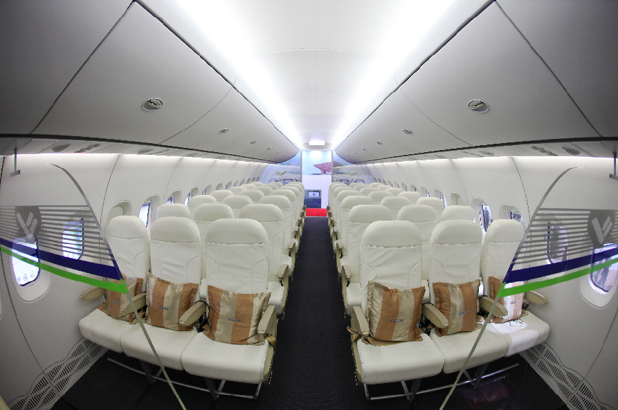 机舱内部 “大飞哥”这个名字叫起来的确亲切了不少。不过还是想要了解一下,大名C919有什么含义呢? C919:我的全称其实是“COMAC919”。“COMAC”是中国商用飞机有限责任公司英文名称的简写,“C”是COMAC的第一个字母,也是中国的英文名称China第一个字母。第一个“9”寓意天长地久、经久不衰,而“19”的意思是说我的最大载客量是190座。 “大飞哥”是我国首款按照最新国际适航标准研制的干线民用飞机,标准航程是4075公里,增大航程5555公里。 C919:原来有做功课了解我,看来我不说点干货是不行了。听说过吴兴世么?他是大型飞机重大专项专家咨询委员会委员,他可是夸奖了我一番呢。 吴兴世:(C919)机身特别的宽敞,在同类客机里面机身宽度最大的一种,比737宽多了,比320也略宽,大概要有5厘米左右。客舱里面每个座椅、过道宽度也比较宽敞,人站立时离天花板、以及两手展开时与周围的行李架等,这些个空间宽敞,乘坐的心理感受会更好。另一个方面在上下飞机、同时在安放行李时会快捷一些,给乘客带来更好的影响。