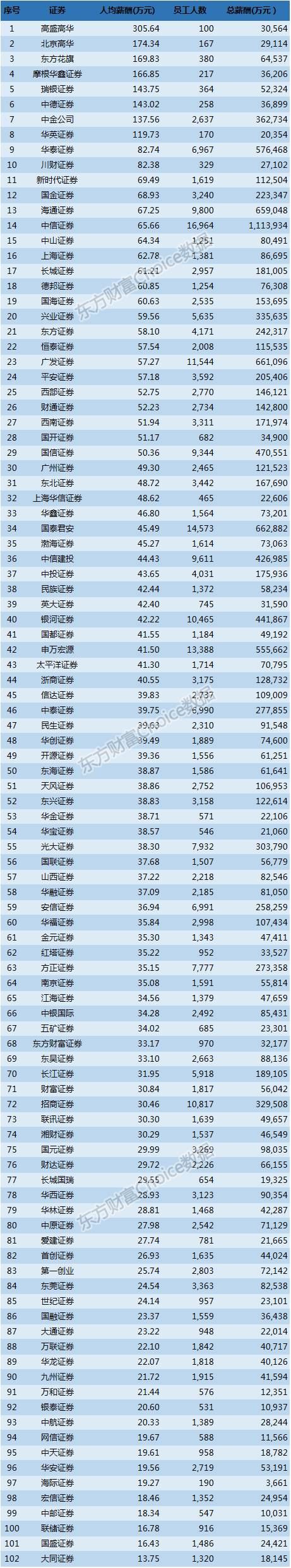 数据来源:东方财富Choice数据,证券公司2016年年报; 人均薪酬=(支付给员工薪酬+期末应付职工薪酬-期初应付职工薪酬)/员工人数,所得为估计数,与实际情况或有出入,仅供参考。 东方财富Choice数据显示,2016年券商行业102家公司支付薪酬总数达到约1374.91亿元,与合计员工人数30.11万人相除,得到行业人均收入约45.65万元. 行业排名中,前8家证券公司2016年的员工人均薪酬超过100万元,排名第一的是高盛高华,达到305.64万元。高盛高华为北京高华与高盛(亚洲)合资设立的证券类子公司,主要开展投资银行业务,年报显示其100名员工中有78名隶属投行领域,2016财年实现营业收入5.33亿元。 无独有偶,还有多家证券公司旗下投行业务子公司的人均薪酬令人称叹, 分别是排名第三位的东方花旗证券(169.93万元,控股股东东方证券)、第四位的摩根华鑫证券(166.85万元,控股股东华鑫证券)、第六位的中德证券(143.02万元,控股股东山西证券)和第八位的华英证券(119.73万元,控股股东国联证券).证券公司投行部门的待遇与薪资水平由此可见一斑,高业务产出、高工作强度与高收入形成正比。 此外,北京高华证券凭借对机构与高净值客户服务、研究咨询与自营等业务,在员工人数较少的情况下,人均薪酬达到174.34万元,位居第二。而瑞银证券和中金公司也是相对侧重投行、固收、财富管理等高端业务,后者在拥有2600多名员工的情况下依然保持人均薪酬百万元以上的水平,称其为“名利场”并不为过。 前10名中,还有华泰证券和川财证券上榜,2016年度人均薪酬分别为82.74万元和82.38万元,前者为A股上市券商中人均薪酬水平最高的公司。 从人均薪酬的分布情况来看,除了8家“百万收入”券商外,平均年收入在50-100万元的证券公司共21家,30-50万元的证券公司有45家,占多数地位(44.12%),还有28家券商员工人均薪酬在10-30万元之间,其中有9家的水平不及20万元,大同证券以13.75万元的人均薪酬居末位。 国内上市券商人均薪酬榜(数据来源:东方财富Choice数据,证券公司2016年年报) A股上市券商方面,28家公司平均人均薪酬约48.41万元,稍高于行业平均水平。其中,华泰证券拔得头筹,2016年的员工人均薪酬约82.74万元;其后为国金证券,68.93万元;第三名为海通证券,67.25万元,中信证券和国海证券的员工人均薪酬也都超过60万元人民币。仅华安证券的人均薪酬不到20万元,为19.56万元,排名最后。 2016年度券商总薪酬支出榜(数据来源:东方财富Choice数据,证券公司2016年年报) 百大券商中,共有35家证券公司2016年度总薪酬支出超过10亿元,中信证券以111.39亿元居首,员工总数近17000人及较高的人均收入水平令其总支出高企。 若将总薪酬支出与当年营业收入作比较,可以发现上述35家券商中有13家的支出占收入比重超过40%,其中长城证券达到51.96%,中金公司和信达证券以49.54%和48.61%紧随其后。 百大券商2016年董监高薪酬排行榜