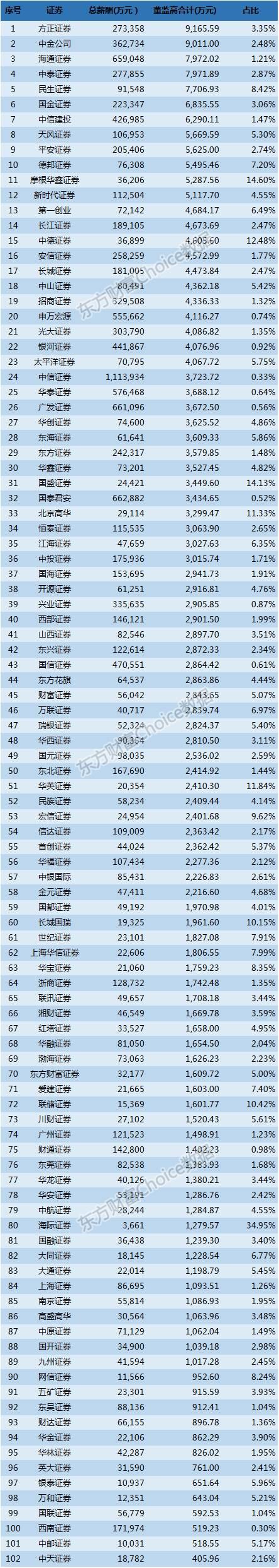 数据来源:东方财富Choice数据,证券公司2016年年报 2016年度,百大券商董事、监事、高级管理人员薪酬合计28.77亿元,占全部总薪酬比重约2.09%。 董监高薪酬合计支出最多的证券公司为方正证券,年度税前发放达到9165.59万元;中金公司紧随其后,支出约9011万元,其年报显示,向公司五名最高薪酬人士支付的各项薪酬福利合计8101万元。此外,海通证券、中泰证券和民生证券的董监高人员合计收入均在7000万元之上。 占比方面,共8家券商董监高薪酬支出占总薪酬支出比重超过10%,其中海际证券的占比最高,达到34.95%。另外7家分别为摩根华鑫证券(14.60%),国盛证券(14.13%),中德证券(12.48%),华英证券(11.84%),北京高华(11.33%),联储证券(10.42%)和长城国瑞证券(10.15%). (原标题:100家券商人均薪酬榜:8家员工的年度人均收入超过100万元!) |