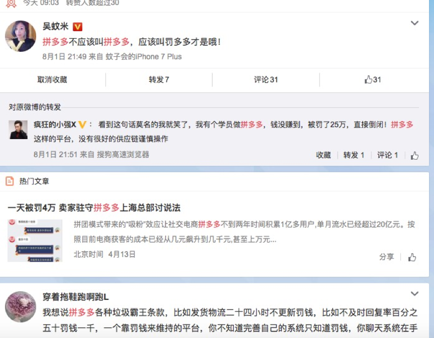 昔日黑马深陷投诉重灾区 拼多多作为电商下半场崛起的黑马,打破流量红利消失的魔咒,以社交为核心切入电商红海,短短两年时间,聚集商家30多万,用户数近两亿,成为电商从业者眼中的一个现象。 反观目前的电商海洋,巨头之外,生鲜电商、各类垂直电商都依然游走在生死的边缘,而唯独拼多多光环附身,在商业媒体的关注重点中,用户数、GMV、投资额永远是赋予企业光环的法杖。但这样的光环背后拼多多以另一种方式走向了舆论的风口,翻开微博、知乎等贴近消费者的社交媒体,投诉与吐槽成为拼多多无限风光背后另一面真实的写照。 根据消费者投诉榜统计,“拼多多”被投诉的主要问题为产品质量差、物流慢、虚假营销宣传、商家虚假发货、拒绝退款、售后服务差等。而从消费者投诉的这些问题来看,几乎是涵盖了电商购物的每一个体验环节。同样,近日各大主流媒体关于拼多多品质问题再次搬向舆论头条,其中,有媒体集中曝光消费者对拼多多的投诉案例。 此外根据知名大V互联网的那点事微博爆料,另一家拼购平台乐拼购的负责人也连发多条微博,就拼多多质量和服务问题发声。 除了在商品质量存在的大量问题,货不对板,物流及售后也成为被消费者屡遭诟病的地方,因为拼团的模式,加上低利润,商家在物流配送环节“从简”也是情理之中。另一方面,对于生鲜品类来说,冷链一直都是一个最为头疼的是,但拼多多创始人在接受媒体采访时表示:拼多多采取快速的流通取代冷链的做法。那么要保证生鲜产品的质量,这个物流要有多块呢? 与此同时,在面临大量投诉的同时,还有一个不可避免的问题就是售后问题,在消费者报道的统计中,大部分用户都表示拼多多售后服务差。 被玩坏了的社交电商:疯狂砸广告自证模式伪命题? 从消费者的反应不难看出,在消费升级浪潮之下,拼多多虽然迅速崛起,但其模式在规模化后面临着诸多的挑战。 首先,拼多多能够在电商红海中夹缝求生快速生长,得益于其低价尾货模式。企业在拼多多上开店的保证金大部分是1000元,个人在拼多多上开店是2000元,只有海淘、水果生鲜和美容类需要交1万元的保证金。这样的低门槛,保证了拼多多商家数量的快速激增,但另一方面低价与低门槛需要付出的代价是商品供应端的乱象。 入驻的低门槛,放宽了商家的供应链把控能力,为了保证低价的同时又能赚钱,这些商家在商品的采购中,只能选择劣质产品,而拼多多处理这些乱象的方式大都是野蛮粗暴,比如处罚措施,有曝光的聊天记录显示,因商家触犯拼多多货不对板规则,五千多单的团单量,被罚款三十多万,根据该商家说法,每一单利润仅有几块钱。 对此有微博大V表示:“拼多多不应该叫拼多多,应该叫罚多多才是哦! ”该条微博的评论中,有用户称,有个学员做拼多多,钱没赚到,被罚了25万,直接倒闭!拼多多这样的平台,没有很好的供应链谨慎操作。对于商家来说,比巨额罚款更致命的是冻结货款,甚至交易款。有商家与业内人士质疑,罚款或才是拼多多的主要盈利模式。