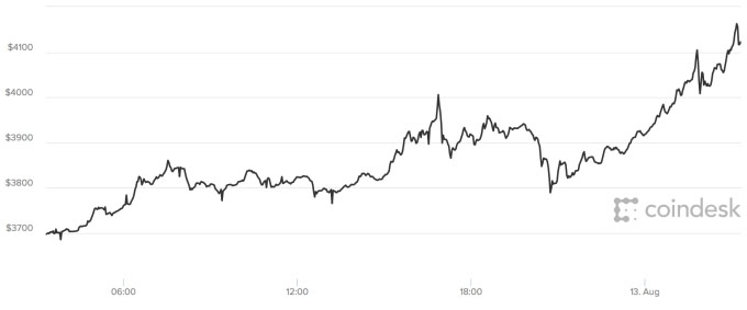 比特币 据科技博客TechCrunch北京时间8月14日报道,上周日,比特币经历了不同寻常的一天。 就在24小时前,比特币的价格还不到3700美元。但是一个小时前,比特币价格飙升到了4000美元以上,而且没有停止的迹象。现在,比特币的价格约为4135美元。一周前,它首次突破了3000美元,创下历史新高。 比特币价格为何不断上涨呢? 两周前,比特币遭遇了硬分叉(hard fork),但基本上没有受到影响。一个名为“比特币现金”的比特币复制品被创造出来,但是获得的关注度远不及多数人的预期。几天后,比特币锁定“隔离见证”,为区块释放了更多空间,允许每个区块存储更多交易。