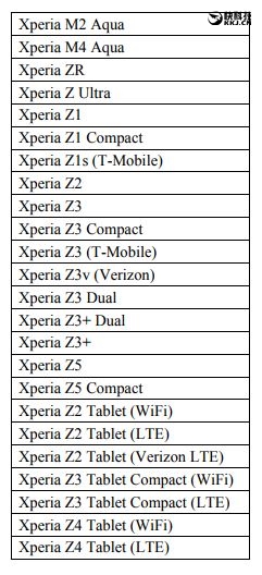 产品目录涉及24款索尼产品,手机几乎涵盖了Xperia Z1到Z5期间的所有产品,平板则有Z2 Tablet到Z4 Tablet。