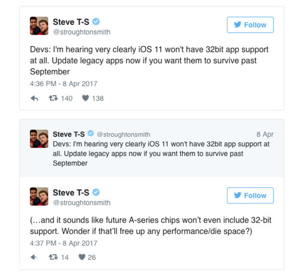 近日,知名开发者Steven Troughton-Smith透露,自iOS11系统开始,将全面停止支持32位应用,届时,App Store中将有大批32位应用无法正常工作。