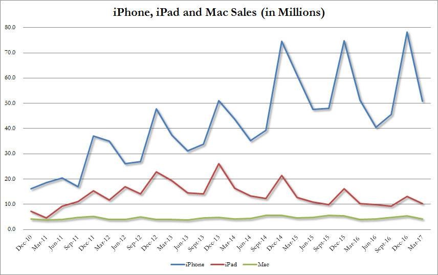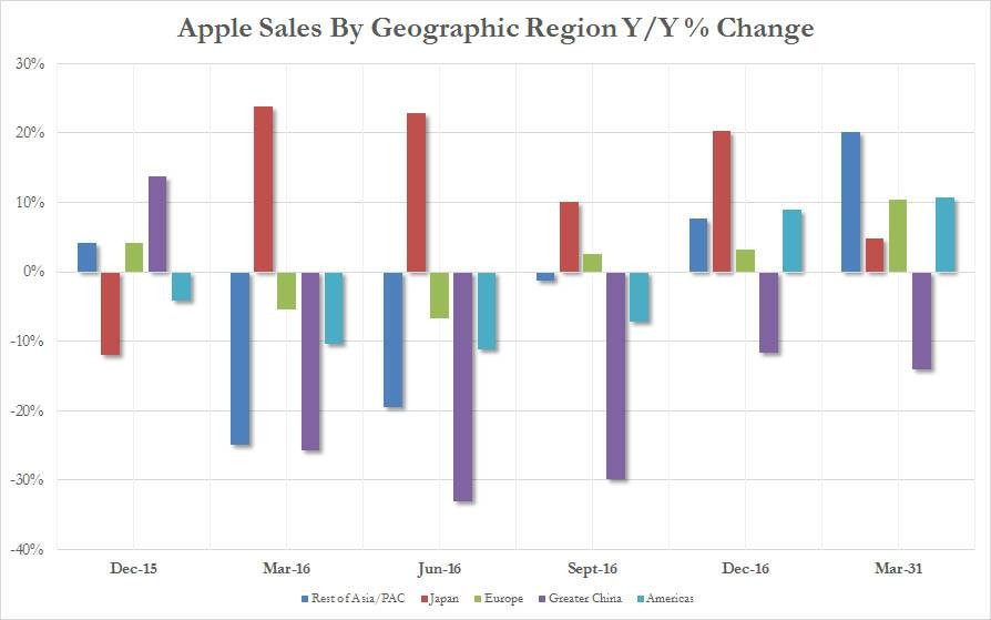 对于曾经“傲娇”的苹果来说,这样的降价幅度显然已经“降尊纡贵”了,然而尴尬的是,这仍然没能调动中国用户们的胃口。是的,大中华区的iPhone销量还是不可避免地下滑了。 苹果销售低迷,又是中国市场拖累 5月3日,苹果公司发布了2017财年第二财季业绩。报告显示,苹果公司第二财季营收为528.96亿美元,高于去年同期的505.57亿美元;净利润为110.29亿美元,相比之下去年同期分为105.2亿美元;当季调整后每股收益为2.10美元,预期2.02美元。 尽管营收净利等指标仍在增长,每股收益也高于预期,但是iPhone在中国卖不动的问题则变得越来越突出,这方面我们从各地区的营收对比就能看得明白: 按地区划分,苹果公司第二财季美洲部门营收为211.57亿美元,同比增长11%; 欧洲部门营收为127.33亿美元,同比增长10%; 日本部门营收为44.85亿美元,同比增长5%; 亚太其他地区营收为37.95亿美元,同比增长20%; 大中华区营收为107.26亿美元,比去年同期的124.86亿美元下滑14%。