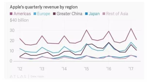 ▲苹果各类产品销售走势图 为啥中国差?库克:他们都在等iPhone 8 对于一季度iPhone销量低于预期的原因,苹果公司CEO蒂姆·库克称,手机销量只是暂时下跌,可能发布的“重磅iPhone 8”市场传闻影响了公司的手机销量,有关未来产品的报道可能导致消费者推迟购买iPhone。但是除了中国内地和港澳台地区,其实iPhone的销售成绩并不逊色。 库克预计,大中华区的业绩料将在今年第二季度“大幅改善”,但“恐难重拾增长”。