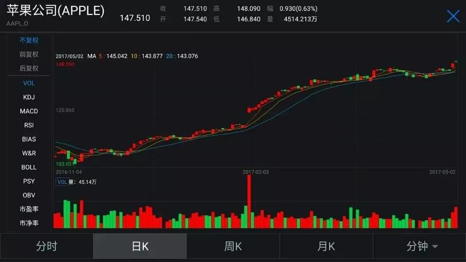 ▲中国市场曾短暂超越欧洲市场,成为苹果仅次于美国的第二大市场 路透报道认为,按惯例苹果今秋会推出新版iPhone,供应链方面的消息显示iPhone 8会有重大升级,这可能有助于今年年末iPhone的销售增长,但也可能意味着,消费者会等待iPhone 8登场再购买,那么第三季度苹果的营收可能进一步走低。 本周二苹果股价高位震荡,盘中一度触及148.09美元的历史高位,最终收盘报147.51美元,仍然达到收盘历史新高,自今年1月31日发布第一财季财报以来苹果股价已累计上涨22%。