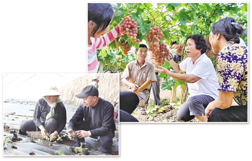 左下图 东北农业大学新农院专家李景富教授基层指导番茄移栽。 本报记者 杜 芳摄 右上图 湖南农业大学石雪晖教授向澧县农民传授葡萄种植技术。本报记者 杜 芳摄