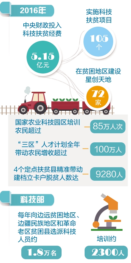 “2016年是‘十三五’开局之年,也是打赢脱贫攻坚战的首战之年。”科技部副部长徐南平告诉《经济日报》记者:“科技部采取超常规举措,投入大量人力物力,科技扶贫工作成效初步显现,科技扶贫品牌影响力大幅提升。” 据统计,2016年中央财政投入科技扶贫经费5.15亿元,实施科技扶贫项目105个,在贫困地区建设72家星创天地;国家农业科技园区培训农民超过85万人次,“三区”人才计划全年带动农民增收超过100万人,4个定点扶贫县精准带动建档立卡户脱贫人数达9280人。 输送智力开启创业式扶贫 在江西省井冈山市鹅岭乡蕉陂村,占地230亩的245个标准化钢架大棚蔚为壮观。每到育苗季节,大棚内的芦笋秧苗郁郁葱葱。这种一次栽培多年受益的经济作物,一次种植可收益15年以上,平均亩产3000斤左右,收入约为水稻的8倍。 经过考察,科技专家发现,这里的自然环境非常适宜芦笋生长,为了带领百姓脱贫致富,把山区资源优势转化为农业发展优势,当地政府运用科技的力量,提供“全程无障碍的帮助和服务”,在当地掀起了一股创业式扶贫高潮。 据温州来此投资的商人李秉谦介绍,井冈山瓯峰农业科技有限公司成立伊始,江西省农科院就在基地建立了芦笋种苗培育基地,不但向公司提供优质种苗,还长期配套技术指导服务。因此从一开始公司的芦笋就走上了“科技强苗”的高端道路,有害生物无害化控制、化学替代与养分管理、土壤培肥与健康保育等先进技术纷纷引进,往往还没收割就被订购一空,价格是普通芦笋的2倍。 科技效益初显,公司和农户实现了双赢。为进一步提高当地农民的生产技能,江西省蔬菜产业科技人员定期来基地举办芦笋种植技术培训班,累计培训农民200余户。更可喜的是,以往靠政府救济的贫困户家庭,依靠科技的力量,不但就近就业,还通过流转土地摇身一变成了“股东”。 目前,已有86户贫困家庭通过土地入股、基地务工等不同形式参与芦笋种植产业,2016年发放贫困户土地租金21万元,务工工资110万元,人均收入1.6万元,实现了鹅岭乡一半以上贫困户脱贫致富。 这样的例子在井冈山17个乡镇中比比皆是。“‘十二五’以来,仅支持井冈山科技扶贫项目就有40项,支持金额达5000多万元。该地区贫困人口由‘十二五’初期的31145人降至现在的7537人,减幅达75.8%,贫困发生率由28.3%降至现在的1.5%。”科技部农村科技司司长兰玉杰说。 “科技扶贫的特点之一便是聚焦贫困地区突出存在的两大短板——科技和人才,聚集创新资源,打造创业式扶贫。”兰玉杰表示,着力开展创业式扶贫,为扶贫开发提供强有力的智力支撑既是精准扶贫的药到病除之法,也是摆脱贫困的根本之道。 以科技为动力,井冈山的广大村民在青山绿水间迈上了丰衣足食的康庄大道,而在其他贫困问题比较突出的地区,科技扶贫也在轰轰烈烈地展开。据悉,科技部每年向边远贫困地区、边疆民族地区和革命老区贫困县选派科技人员约1.8万名,培训约2300人,引导科技成果向贫困地区转移转化。通过智力输送,科技扶贫开出不一样的花朵,实现了既扶理念又扶方法,既扶技能又扶素养,既扶志气更扶信心。 因地制宜注入“造血”功能 坚持机制体制创新、不断优化顶层设计,为“十三五”科技扶贫工作的稳中求进奠定了坚实基础。正如徐南平所说,“多年的科技扶贫工作涌现出以李保国为代表的一大批先进典型,创造出了‘大别山之路’‘太行山道路’‘陕北合力扶贫’等经验,谱写了‘把论文写在大地上’的壮丽诗篇”。 2016年,国务院办公厅下发《关于深入推行科技特派员制度的若干意见》,引导各类科技创新创业人才和单位整合科技、信息、资金、管理等现代生产要素,深入农村基层一线开展科技创业和服务,与农民建立“风险共担、利益共享”的共同体,推动农村创新创业深入开展。 “我们的科技扶贫干部派下去以后,施行‘一县一策’制,做到因地制宜、有的放矢。”兰玉杰说。 服务辽宁省新宾县的科技特派员屈连伟对此深有感触。原是辽宁省科学院花卉所副研究员的他,初来新宾就发现,诸如栽培技术落后、农药化肥用量过大等问题困扰着当地花卉产业的发展。“造血扶贫的关键是扬长避短,要有个性化的扶贫方案。”屈连伟说。 为此,屈连伟团队立即组织技术培训,并亲自种了一个温室的切花菊。他采用单层网技术生产出的菊花个个笔直,符合出口标准,单此一项每亩就节约材料成本400元。花农们看了心服口服,连连称赞:“这效果太好了,以后要相信科学。” 如今在辽宁省新宾县,菊花产业已有近万亩的规模。每逢金秋时节,漫山遍野的各类菊花竞相盛开,信步其间,如履仙境,乡村之美,美不胜收。这些争奇斗艳的切花菊凝聚着科技特派员的心血,寄托着农民脱贫致富的希望。 “造血扶贫的重点是要抓龙头企业,有了龙头企业就有了市场,农民就不用担心东西卖不掉。”屈连伟告诉记者,为了解决嫁接艺菊茎秆细弱、花色单一等种植难题,科技特派员带领花卉生产大户到花卉所选择他们满意的品种。“这么多菊花品种,我还是头一次看到,这个绿色的株型很好看,那个紫色的我也想引进。”资源圃内,种花大户们难掩内心的喜悦。 在屈连伟和他的团队努力下,2016年,新宾县新增花卉种植面积1500亩;新增生产盆栽小菊300万盆;辐射带动3个乡镇的花农生产,辐射面积达2000多亩,实现经济效益2000万